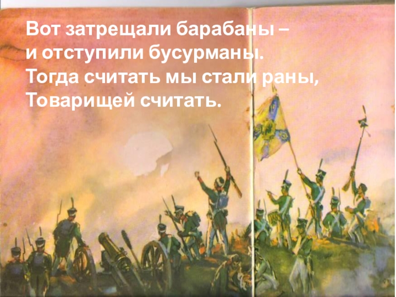 Вот затрещали барабаны – и отступили бусурманы.Тогда считать мы стали раны,Товарищей считать.