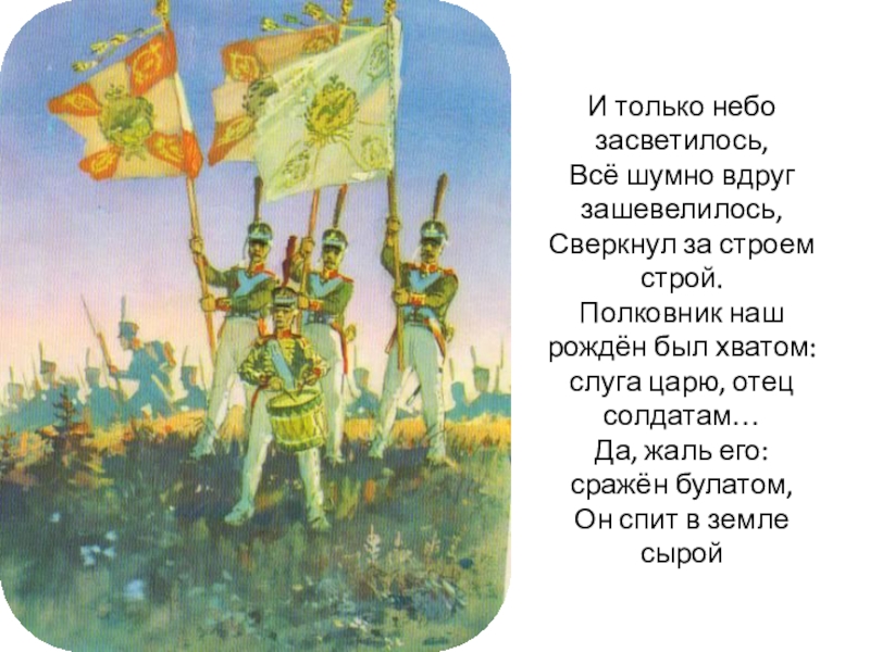Слайд 10И только небо засветилось, Всё шумно вдруг зашевелилось, Сверкнул за строем строй. Полковник