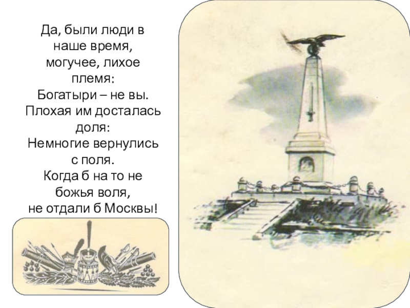 Да, были люди в наше время, могучее, лихое племя: Богатыри – не вы. Плохая им досталась доля: