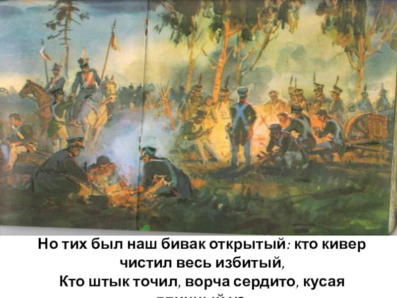 Слайд 9Но тих был наш бивак открытый: кто кивер чистил весь избитый, Кто