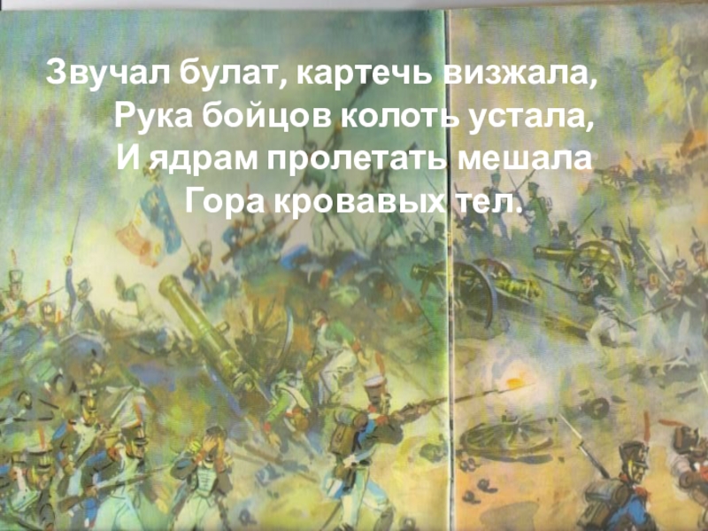 Звучал булат, картечь визжала, Рука бойцов колоть устала,И ядрам пролетать мешалаГора кровавых тел.