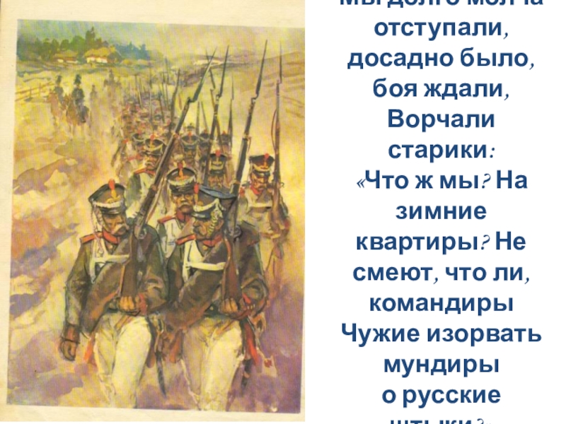 Мы долго молча отступали, досадно было, боя ждали, Ворчали старики: «Что ж мы? На зимние квартиры? Не