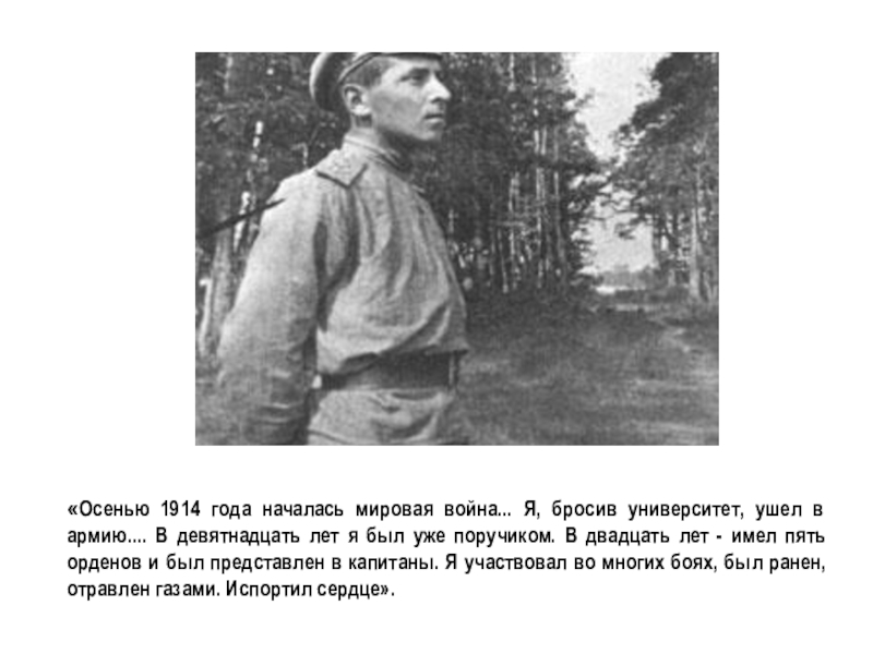 Слайд 11«Осенью 1914 года началась мировая война... Я, бросив университет, ушел в