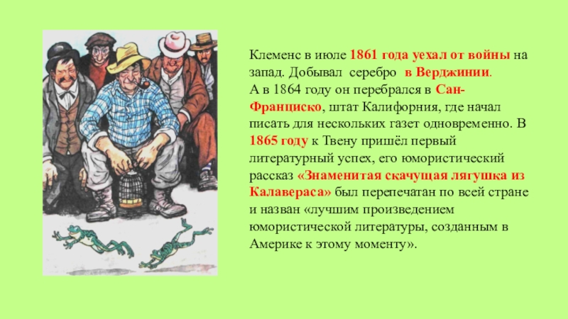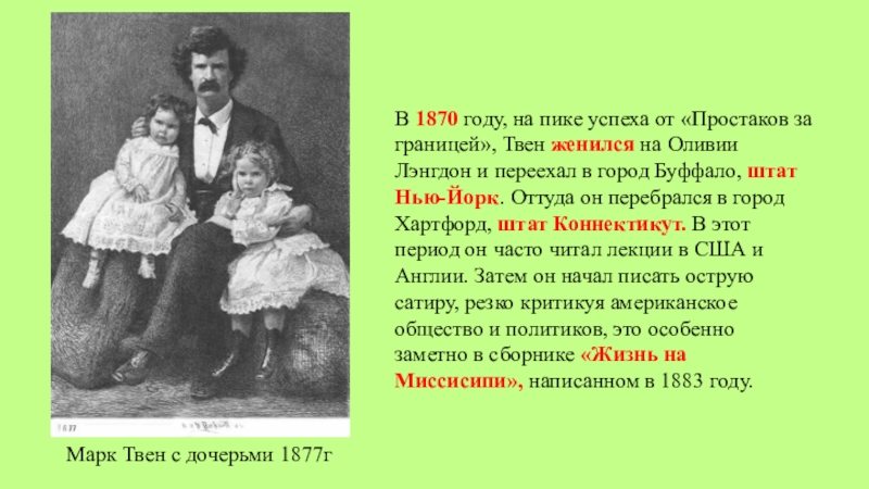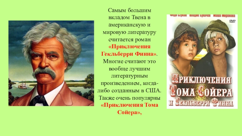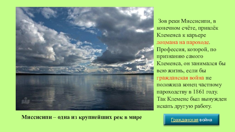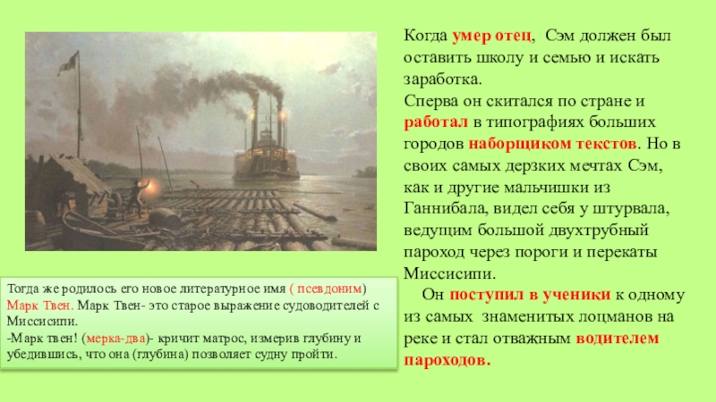 Тогда же родилось его новое литературное имя ( псевдоним) Марк Твен. Марк Твен- это старое выражение судоводителей с Миссисипи.