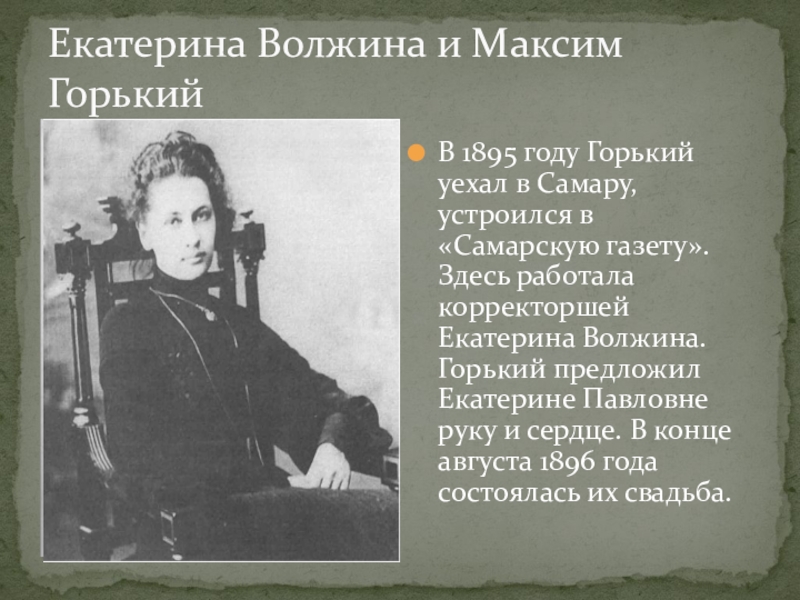 устроился в «Самарскую газету». Здесь работала корректоршей Екатерина Волжина. Горький предложил Екатерине Павловне руку и сердце. В конце августа 1896 года состоялась их свадьба.