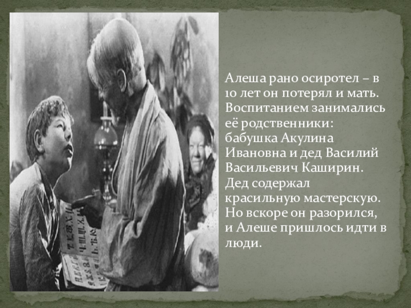 Воспитанием занимались её родственники: бабушка Акулина Ивановна и дед Василий Васильевич Каширин. Дед содержал красильную мастерскую. Но вскоре он разорился, и Алеше пришлось идти в люди.