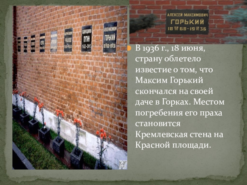 Максим Горький скончался на своей даче в Горках. Местом погребения его праха становится Кремлевская стена на Красной площади.