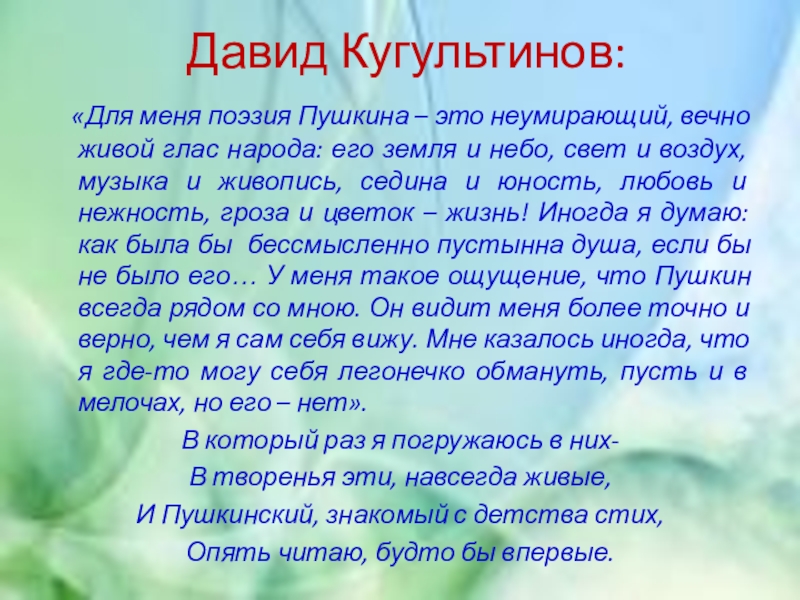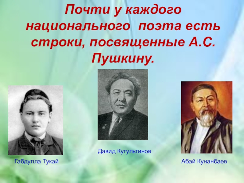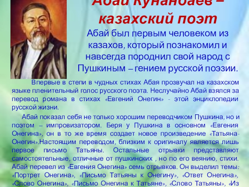 Впервые в степи в чудных стихах Абая прозвучал на казахском языке пленительный голос русского поэта. Неслучайно Абай взялся за перевод романа в стихах «Евгений Онегин» - этой энциклопедии русской жизни.
