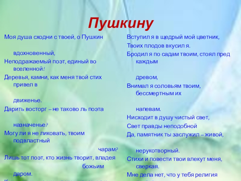 Абай показал себя не только хорошим переводчиком Пушкина, но и поэтом – импровизатором. Беря у Пушкина в основном «Евгения Онегина», он в то же время создает новое произведение «Татьяна-Онегин».Настоящим переводом, близким к оригиналу является лишь первое письмо Татьяны. Остальные отрывки представляют самостоятельные, отличные от пушкинских , но по его веянию, стихи. Абай перевел из «Евгения Онегина» семь отрывков. Он выделил темы: «Портрет Онегина», «Письмо Татьяны к Онегину», «Ответ Онегина», «Слово Онегина», «Письмо Онегина к Татьяне», «Слово Татьяны», «Из монолога Ленского». Завершает цикл «Предсмертное слово Онегина». Как известно, такой части у Пушкина нет.