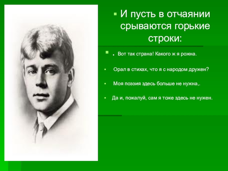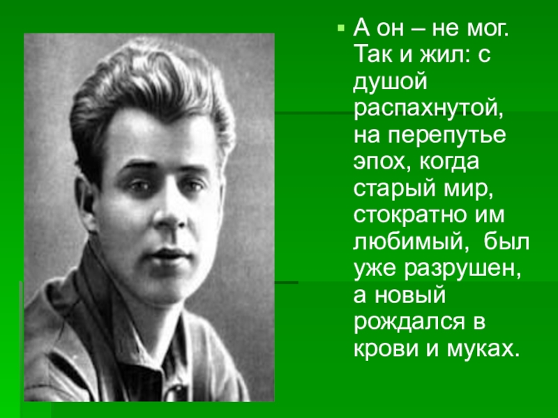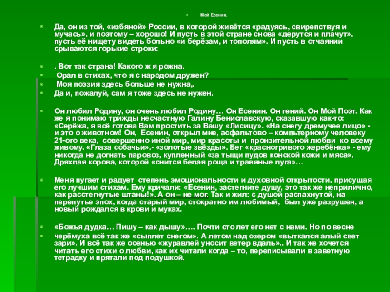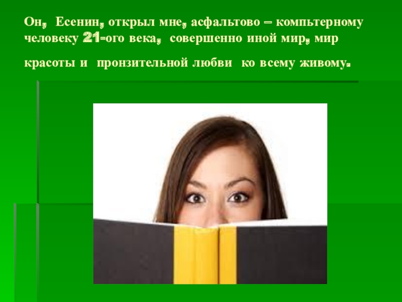 Слайд 10Он, Есенин, открыл мне, асфальтово – компьтерному человеку 21-ого века, совершенно