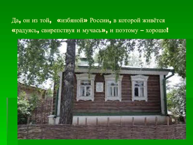Слайд 3Да, он из той, «избяной» России, в которой живётся «радуясь, свирепствуя