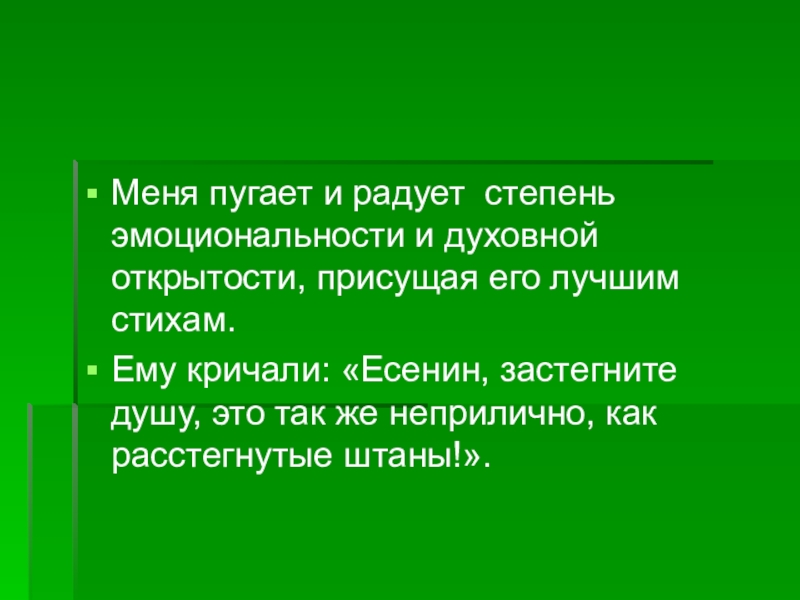 Меня пугает и радует степень эмоциональности и духовной открытости, присущая его лучшим стихам. Ему кричали: «Есенин, застегните