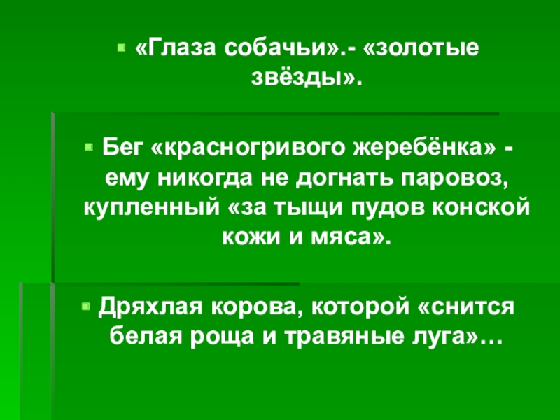 «Глаза собачьи».- «золотые звёзды». Бег «красногривого жеребёнка» - ему никогда не догнать паровоз, купленный «за тыщи пудов