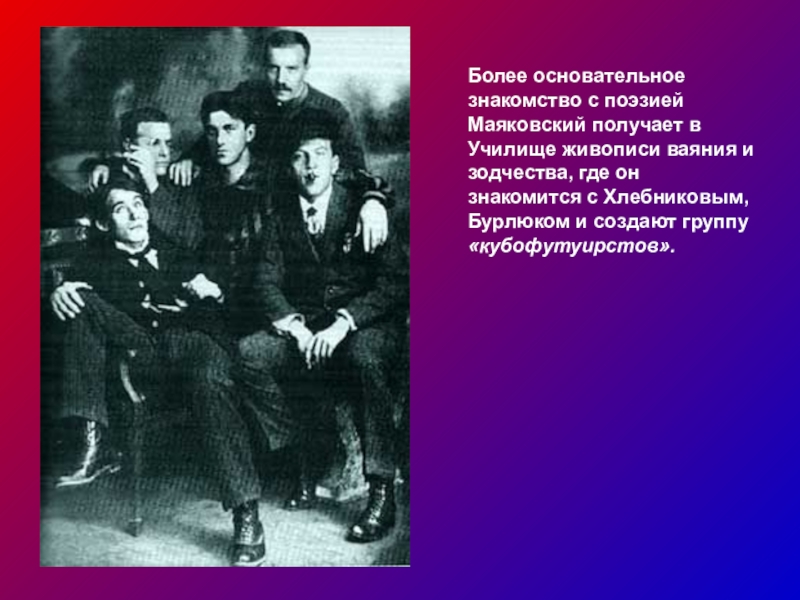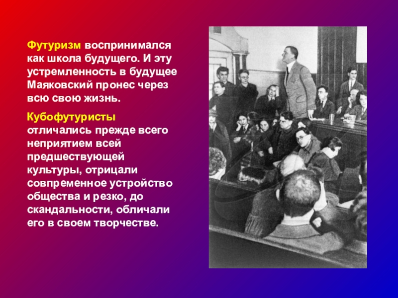 Кубофутуристы отличались прежде всего неприятием всей предшествующей культуры, отрицали совпременное устройство общества и резко, до скандальности, обличали его в своем творчестве.