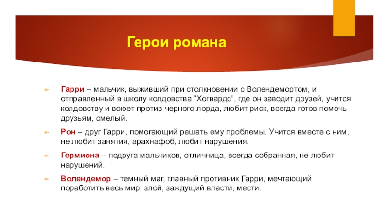 Герои романаГарри – мальчик, выживший при столкновении с Волендемортом, и отправленный в школу колдовства “Хогвардс”, где он