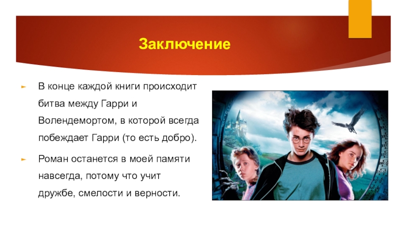 О романеЭтот фантазийный роман мне очень понравился, потому что в нём заложен захватывающий сюжет и есть очень неожиданные повороты. Роман повествует о мальчике по имени Гарри, который узнает, что он волшебник и отправляется в школу колдовства