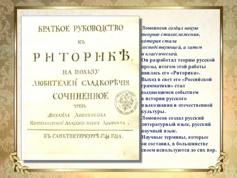 Слайд 40Ломоносов создал новую теорию стихосложения, которая стала господствующей, а затем и классической.