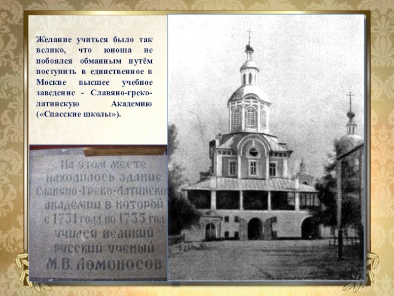 Слайд 12Желание учиться было так велико, что юноша не побоялся обманным путём