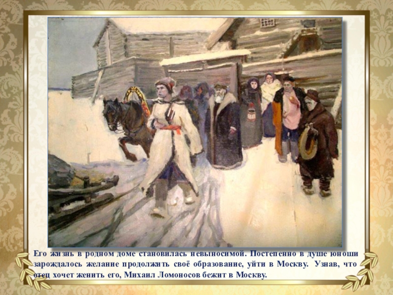 зарождалось желание продолжить своё образование, уйти в Москву. Узнав, что отец хочет женить его, Михаил Ломоносов бежит в Москву.