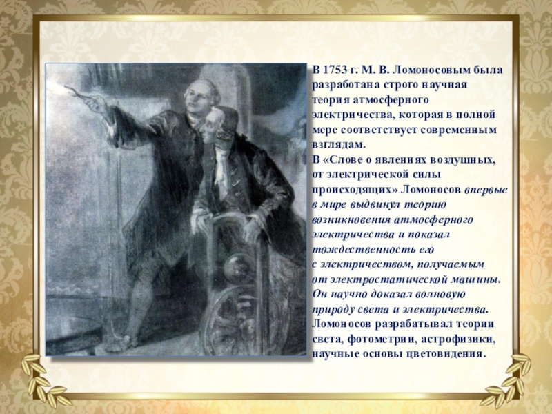 Слайд 37В 1753 г. М. В. Ломоносовым была разработана строго научная теория атмосферного электричества, которая в полной мере