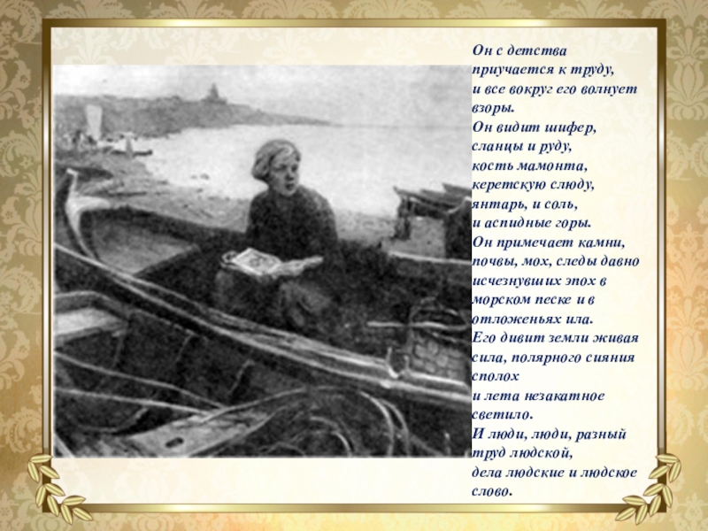 Он примечает камни, почвы, мох, следы давно исчезнувших эпох в морском песке и в отложеньях ила.