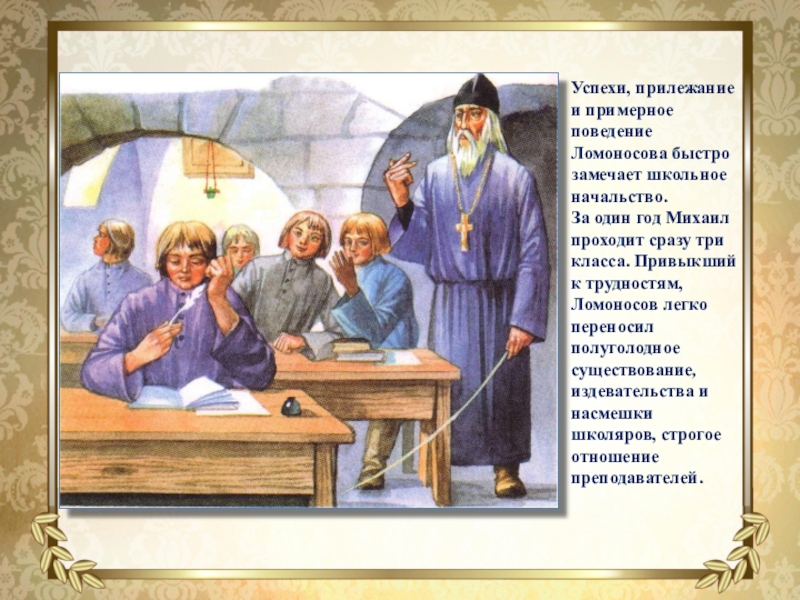 Слайд 13Успехи, прилежание и примерное поведение Ломоносова быстро замечает школьное начальство.