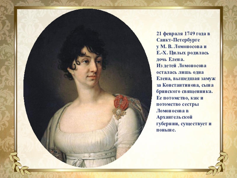 Из детей Ломоносова осталась лишь одна Елена, вышедшая замуж за Константинова, сына брянского священника. Ее потомство, как и потомство сестры Ломоносова в Архангельской губернии, существует и поныне.