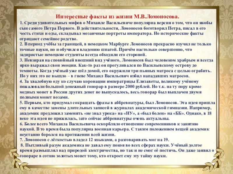 4. За хвалебную оду ко случаю коронации императрицы Елизаветы, великому учёному пожаловали большой денежный гонорар в размере 2000 рублей. Но т.к. на ту пору кроме медных монет в России других денег не выпускалось, весь гонорар был выплачен двумя полными монет возами.