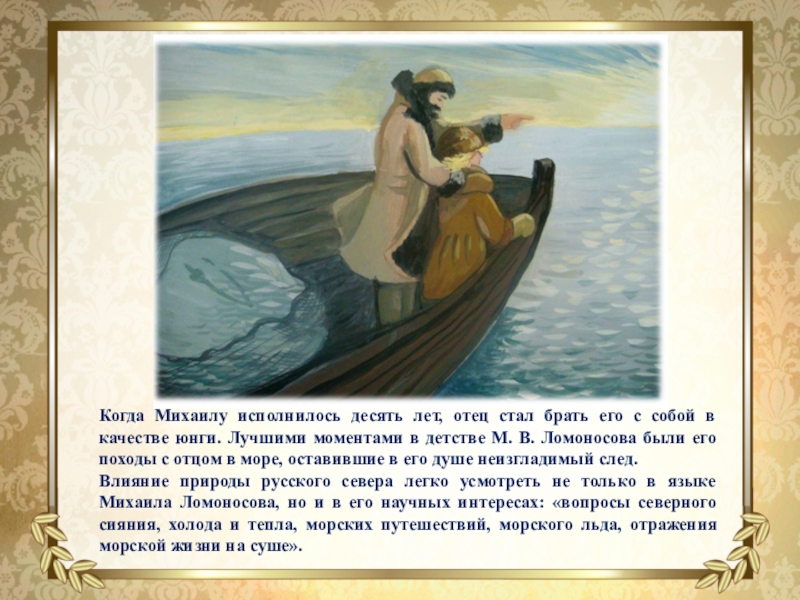 в качестве юнги. Лучшими моментами в детстве М. В. Ломоносова были его походы с отцом в море, оставившие в его душе неизгладимый след.