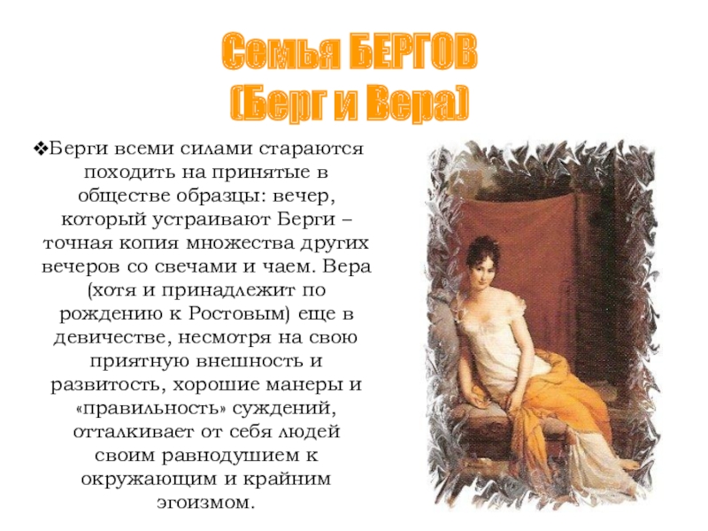 в обществе образцы: вечер, который устраивают Берги – точная копия множества других вечеров со свечами и чаем. Вера (хотя и принадлежит по рождению к Ростовым) еще в девичестве, несмотря на свою приятную внешность и развитость, хорошие манеры и «правильность» суждений, отталкивает от себя людей своим равнодушием к окружающим и крайним эгоизмом.