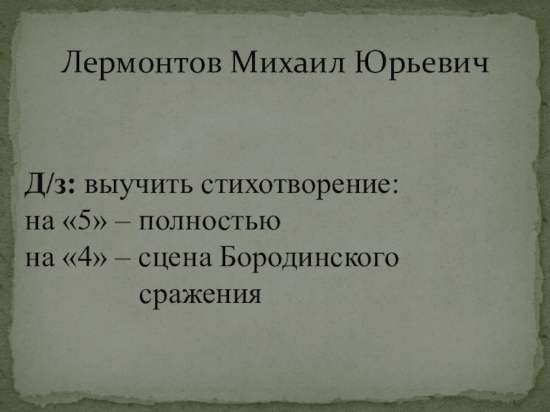 Лермонтов Михаил ЮрьевичД/з: выучить стихотворение: на «5» – полностью на «4» – сцена Бородинского