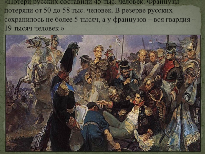 Слайд 9«Потери русских составили 45 тыс. человек. Французы потеряли от 50 до