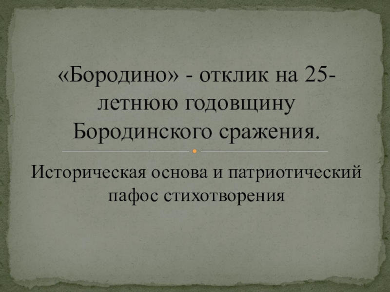 Историческая основа и патриотический пафос стихотворения«Бородино» - отклик на 25-летнюю годовщину Бородинского сражения.
