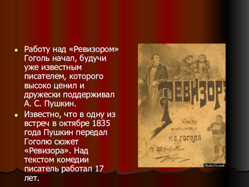 Известно, что в одну из встреч в октябре 1835 года Пушкин передал Гоголю сюжет «Ревизора». Над текстом комедии писатель работал 17 лет.