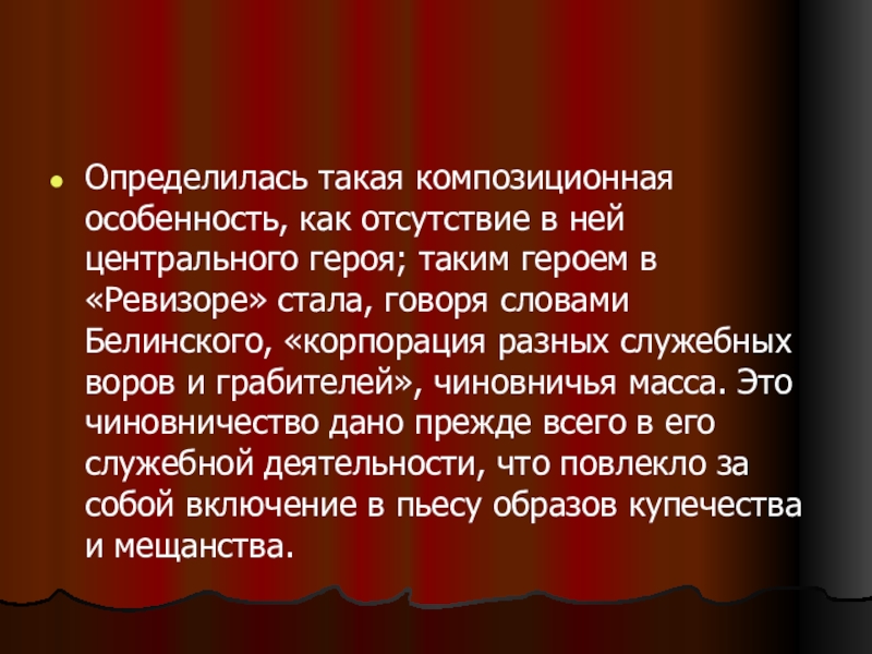 героем в «Ревизоре» стала, говоря словами Белинского, «корпорация разных служебных воров и грабителей», чиновничья масса. Это чиновничество дано прежде всего в его служебной деятельности, что повлекло за собой включение в пьесу образов купечества и мещанства.