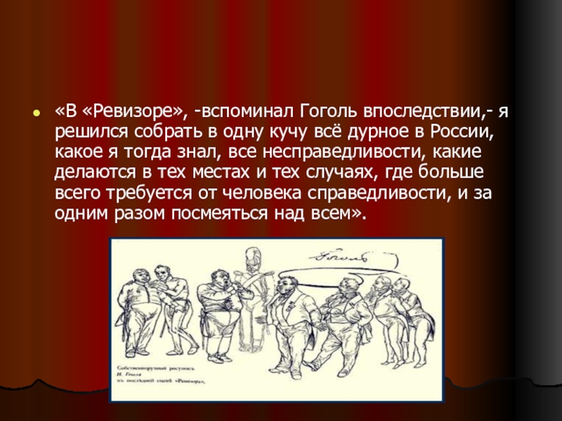 «В «Ревизоре», -вспоминал Гоголь впоследствии,- я решился собрать в одну кучу