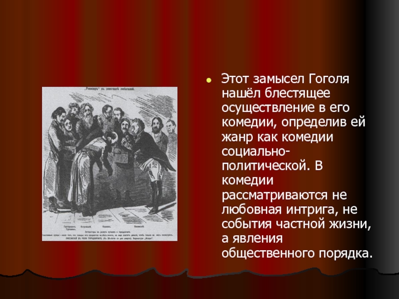 Этот замысел Гоголя нашёл блестящее осуществление в его комедии, определив ей