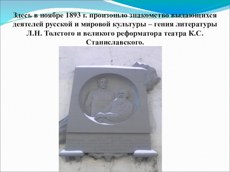 Здесь в ноябре 1893 г. произошло знакомство выдающихся деятелей русской и мировой культуры – гения литературы Л.Н.