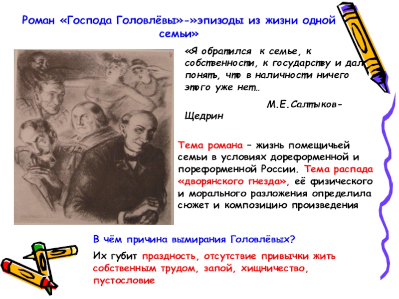 Автор показывает, как происходит постепенное разложение и вымирание помещичьего рода. Этому способствует избранный писателем жанр семейной хроники. Писатель превращает семейную хронику Головлёвых в социально – психологический роман