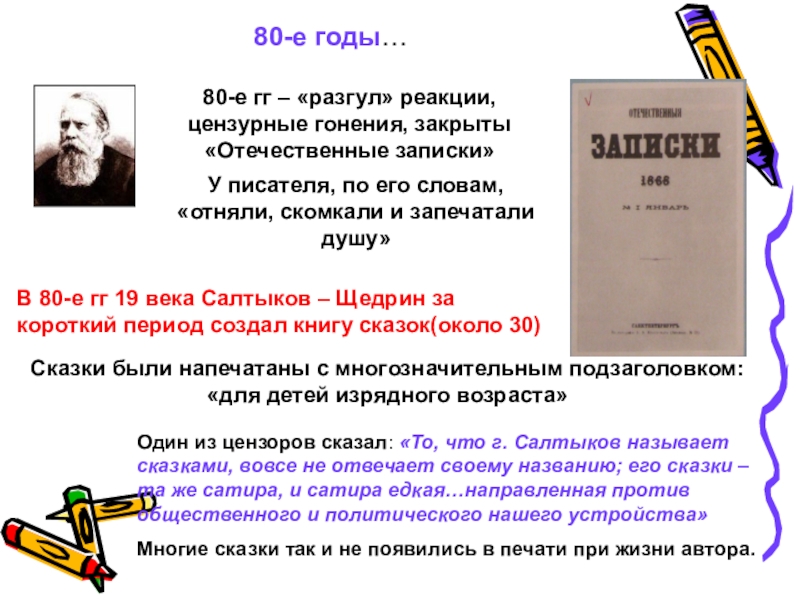 Один из цензоров сказал: «То, что г. Салтыков называет сказками, вовсе не отвечает своему названию; его сказки – та же сатира, и сатира едкая…направленная против общественного и политического нашего устройства»