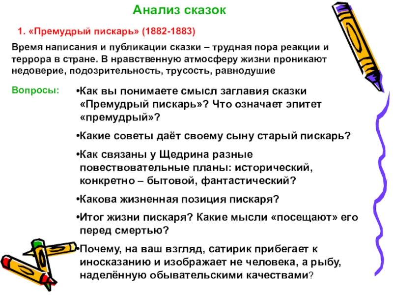 Изображением жалкой участи трусливого пискаря, замуровавшего себя в тесную норку, сатирик высказал своё презрение всем тем, кто, покорясь инстинкту самосохранения, уходил от общественной жизни в узкий мир личных интересов. Салтыков – Щедрин приписал мелкой и жалкой рыбёшке человеческие черты и вместе с тем показал, что человеку присущи «рыбьи» черты.
