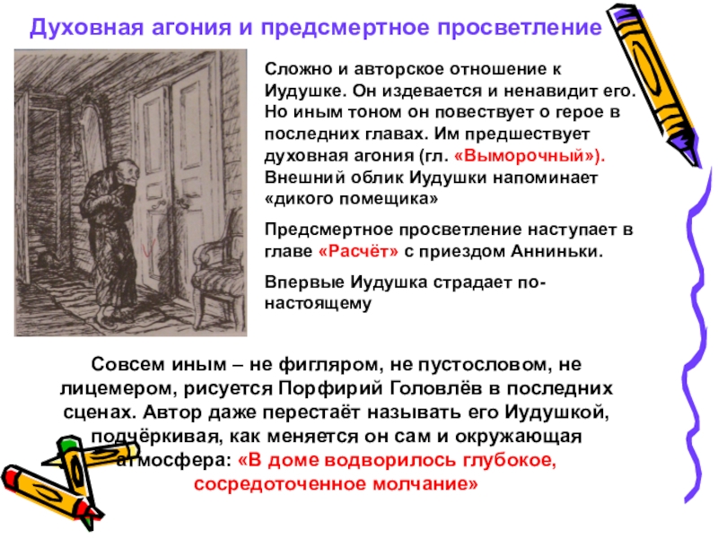 Совсем иным – не фигляром, не пустословом, не лицемером, рисуется Порфирий Головлёв в последних сценах. Автор даже перестаёт называть его Иудушкой, подчёркивая, как меняется он сам и окружающая атмосфера: «В доме водворилось глубокое, сосредоточенное молчание»
