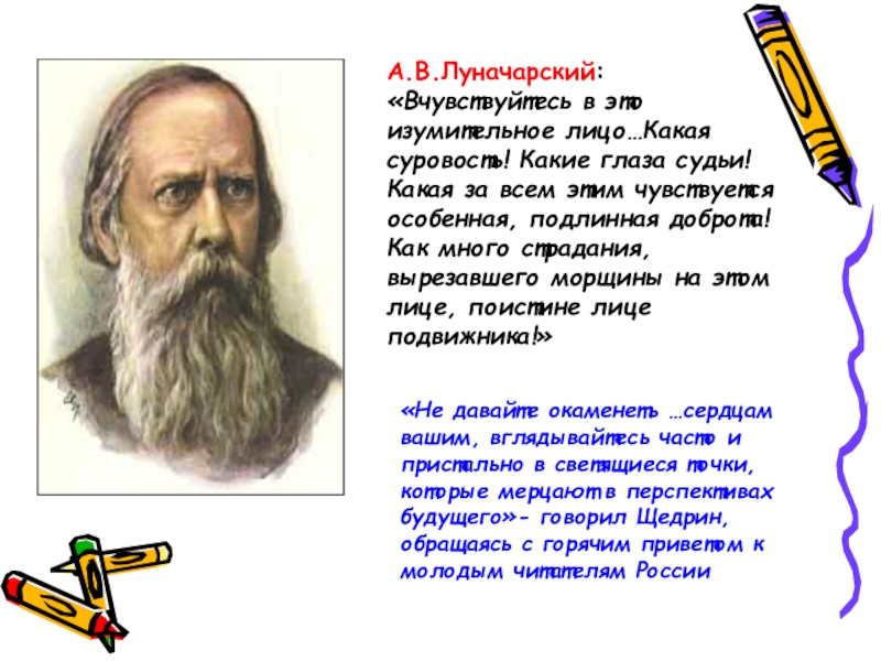 «Не давайте окаменеть …сердцам вашим, вглядывайтесь часто и пристально в светящиеся точки, которые мерцают в перспективах будущего»- говорил Щедрин, обращаясь с горячим приветом к молодым читателям России