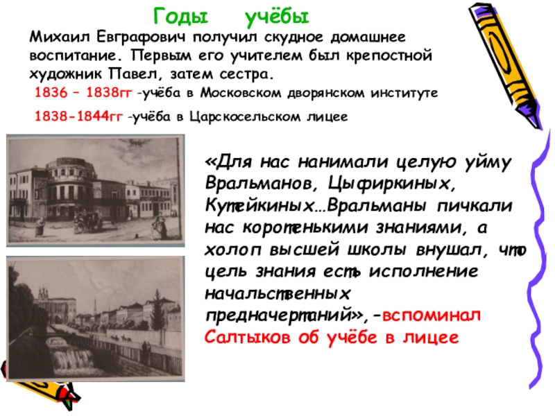 «Для нас нанимали целую уйму Вральманов, Цыфиркиных, Кутейкиных…Вральманы пичкали нас коротенькими знаниями, а холоп высшей школы внушал, что цель знания есть исполнение начальственных предначертаний»,-вспоминал Салтыков об учёбе в лицее