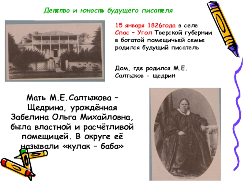 Мать М.Е.Салтыкова – Щедрина, урождённая Забелина Ольга Михайловна, была властной и расчётливой помещицей. В округе её называли «кулак – баба»