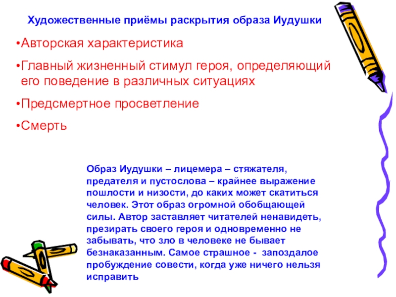 Образ Иудушки – лицемера – стяжателя, предателя и пустослова – крайнее выражение пошлости и низости, до каких может скатиться человек. Этот образ огромной обобщающей силы. Автор заставляет читателей ненавидеть, презирать своего героя и одновременно не забывать, что зло в человеке не бывает безнаказанным. Самое страшное - запоздалое пробуждение совести, когда уже ничего нельзя исправить