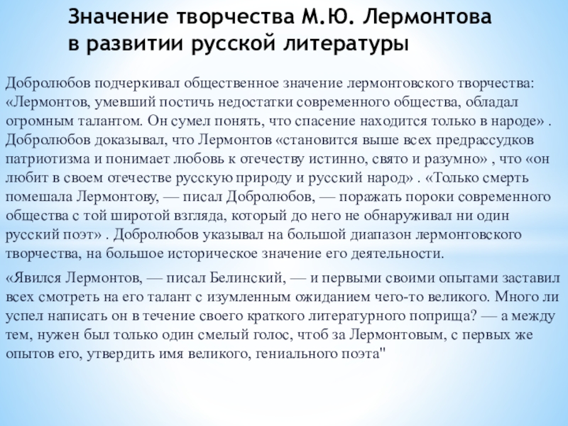 Значение творчества М.Ю. Лермонтова в развитии русской литературы