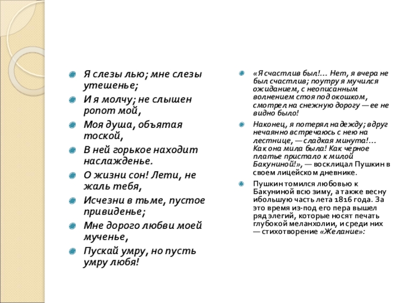 Пушкин томился любовью к Бакуниной всю зиму, а также весну ибольшую часть лета 1816 года. За это время из-под его пера вышел ряд элегий, которые носят печать глубокой меланхолии, и среди них — стихотворение «Желание»: