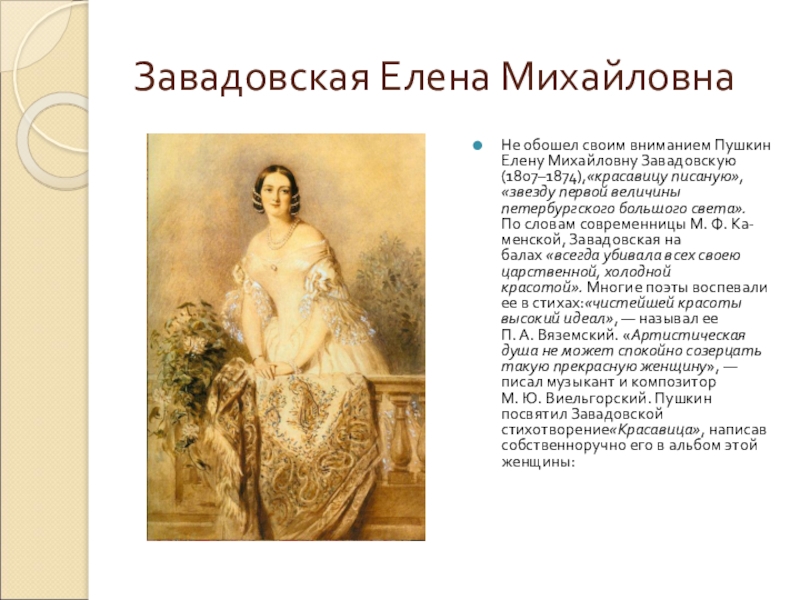 писаную», «звезду первой величины петербургского большого света».По словам современницы М. Ф. Ка-менской, Завадовская на балах «всегда убивала всех своею царственной, холодной красотой». Многие поэты воспевали ее в стихах:«чистейшей красоты высокий идеал», — называл ее П. А. Вяземский. «Артистическая душа не может спокойно созерцать такую прекрасную женщину», — писал музыкант и композитор М. Ю. Виельгорский. Пушкин посвятил Завадовской стихотворение«Красавица», написав собственноручно его в альбом этой женщины: