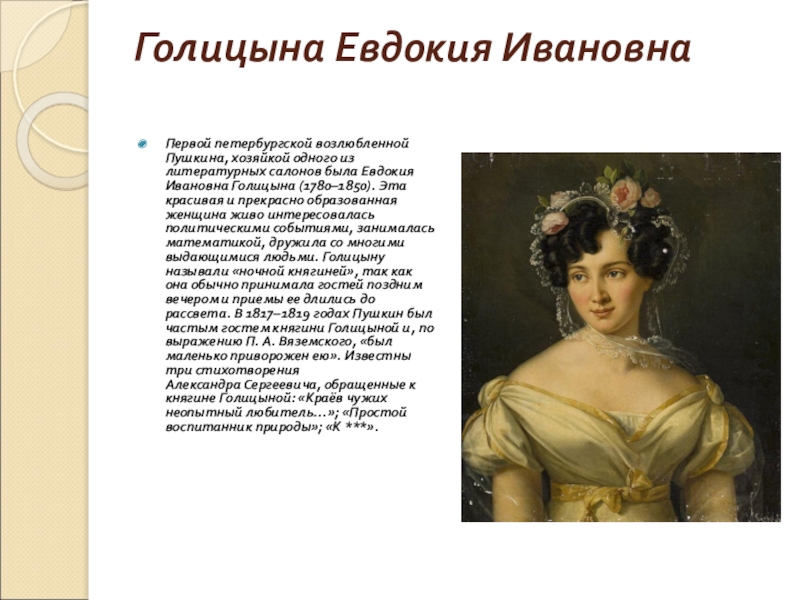 была Евдокия Ивановна Голицына (1780–1850). Эта красивая и прекрасно образованная женщина живо интересовалась политическими событиями, занималась математикой, дружила со многими выдающимися людьми. Голицыну называли «ночной княгиней», так как она обычно принимала гостей поздним вечером и приемы ее длились до рассвета. В 1817–1819 годах Пушкин был частым гостем княгини Голицыной и, по выражению П. А. Вяземского, «был маленько приворожен ею». Известны три стихотворения Александра Сергеевича, обращенные к княгине Голицыной: «Краёв чужих неопытный любитель…»; «Простой воспитанник природы»; «К ***».